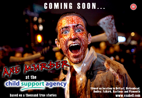 Coming soon to a theatre near you is ‘Axe Murder at the Child Support Agency’. This completely fictitious movie is based on a thousand true stories of how the CSA has driven men to the verge of violence, despair and, in many cases, suicide.
